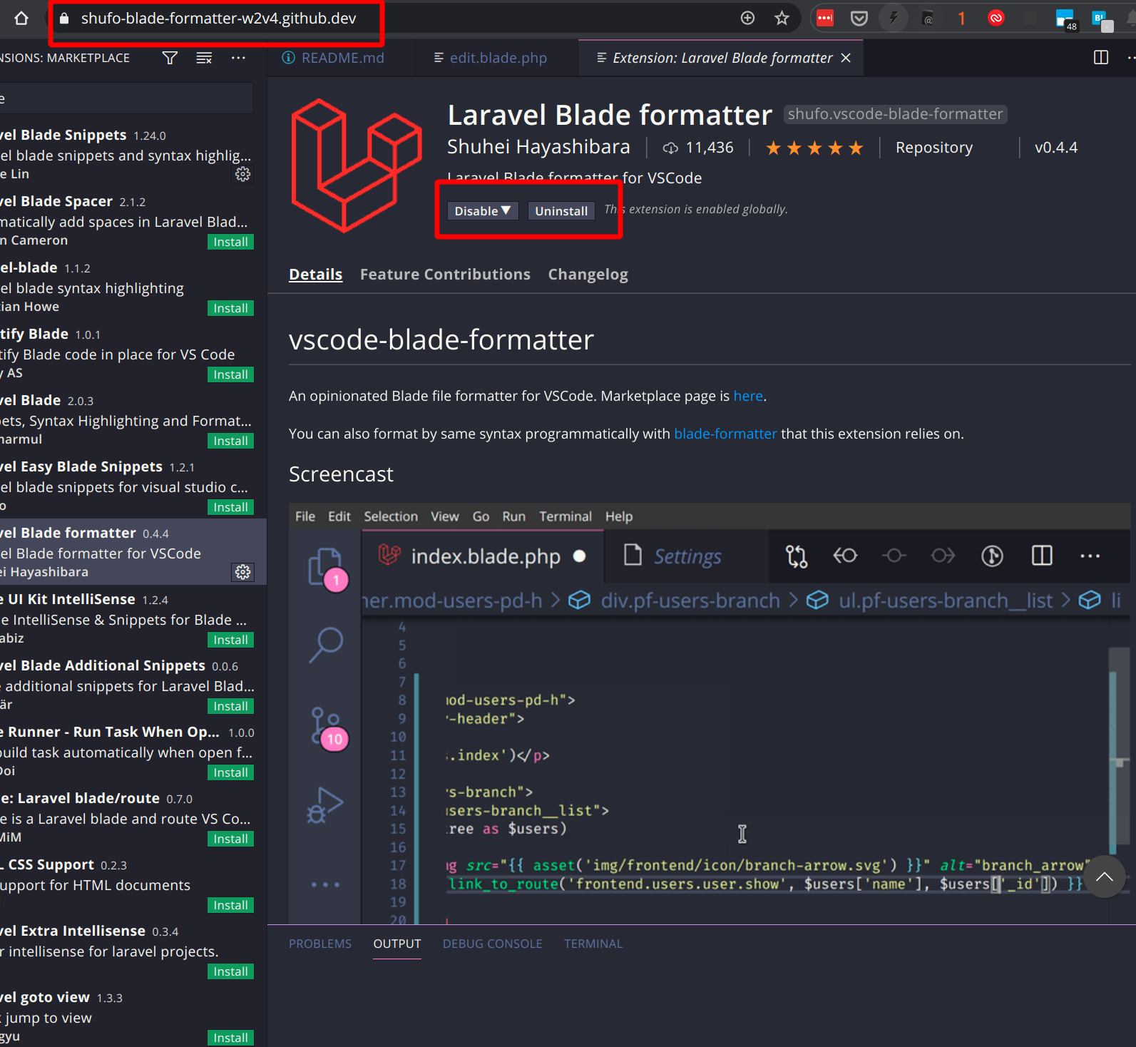 当然VSCodeなのでWeb上でもExtensionを利用出来るのだけど、試しにvscode-blade-formatterをインストールしたところ普通にWebでも動いた