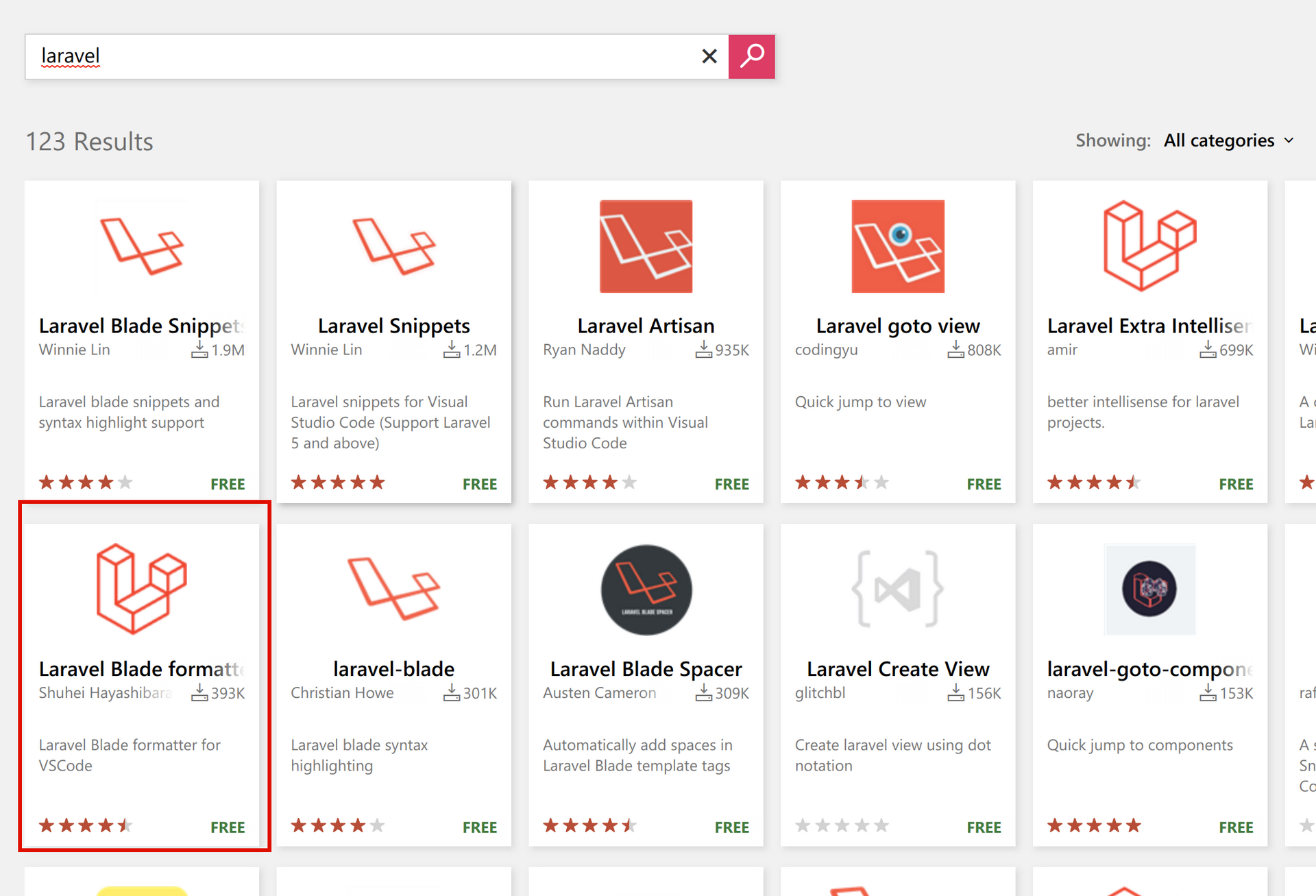 2022-11-20 現在 VSCode Marketplace で Laravel での 検索結果 で上から数えて 7 番目に多くインストールされている拡張機能となっており、Laravel カテゴリーで snippet 系やコマンドショートカット系を除いた拡張機能の中では Laravel Extra Intellisense に次いで実質 2 番目くらいの位置になっている。